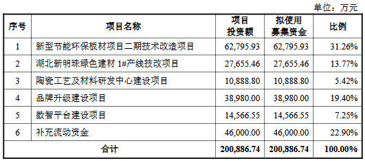 新明珠原拟发行不超过414,026,666股,募集资金200,886.74万元,用于新型节能环保板材项目二期技术改造项目、湖北新明珠绿色建材1#产线技改项目、陶瓷工艺及材料研发中心建设项目、品牌升级建设项目、数智平台建设项目、补充流动资金。