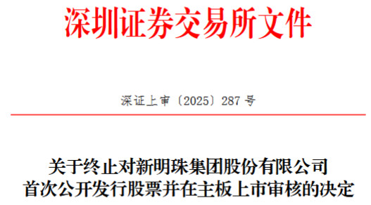 日前,新明珠向深交所提交了《新明珠集团股份有限公司关于撤回首次公开发行股票并在主板上市申请文件的申请》,保荐人向深交所提交了《申万宏源证券承销保荐有限责任公司关于撤回新明珠集团股份有限公司首次公开发行股票并在主板上市申请文件的申请》。根据《深圳证券交易所股票发行上市审核规则(2024年修订)》第六十二条的有关规定,深交所决定终止对新明珠首次公开发行股票并在主板上市的审核。